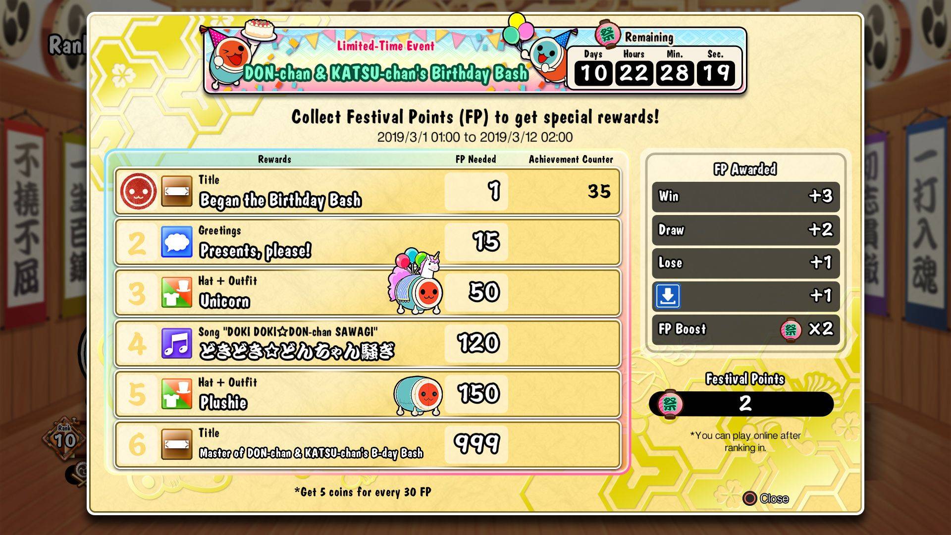 Ab dem 1. März 2019 können SpielerInnen in TAIKO NO TATSUJIN: DRUM SESSION! Für PS4 an den weltweiten Geburtstagsfeierlichkeiten teilnehmen! Dabei können sie ab 10 Uhr morgens bis zum 12. März um 10 Uhr morgens am Ranglisten-Online-Event “DON-can & KATSU-chan’s Birthday Bash” teilnehmen.